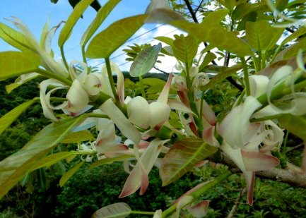 葉片橢圓形,鮮綠色,先端鈍而基部圓形,葉面平滑,互生單葉,羽狀脈。主脈明顯,長8-12公分,寬4-6公分;葉柄1-1.5公分。嫩葉為紅色,具乳白色托葉,當幼葉潤紅展開,乳白色托葉即脫落,而成落葉紛飛的雪白世界,此時新綠又再成綠葉,如此循環。短短一週,經歷了各種變化,又似乎什麼都沒發生一樣,聖嚴法師稱它為「七如來」。