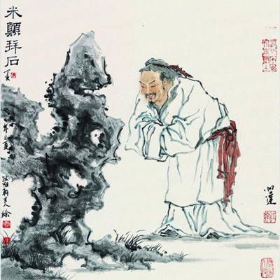 這是著名的「米顛拜石」的典故。後世畫家根據這個典故,繪製了許多佳作,較有名的有明代畫家吳偉的《人物圖卷‧米顛拜石》(今藏上海博物館)。清代畫家任熊的《拜石圖》(今藏北京故宮博物院)等。國畫大師張大千以山水名世,兼精人物花鳥,他的《米顛拜石圖》,也是繪畫中可圈可點的一幅佳作。