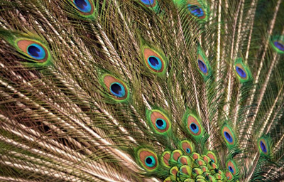 孔雀開屏也是為了保護自己。在孔雀的大尾屏上,可以看到五色金翠線紋,其中散佈着許多近似圓形的「眼狀斑」,這種斑紋從內至外是由紫、藍、褐、黃、紅等顏色組成的。一旦遇到敵人,而來不及逃避時,孔雀便突然開屏,然後抖動它沙沙作響,很多的眼狀斑隨之亂動起來,敵人畏懼於這種「多眼怪獸」,也就不敢貿然前進了。