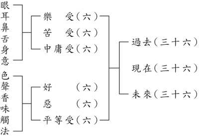 108見者:(一)六根六塵,各有3種,各成18,合成36。