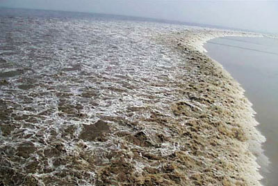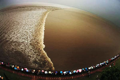 錢塘江潮,是中國最大最壯觀的潮汐,潮頭高達8-10公尺左右,其壯觀景象,洶湧澎湃,氣勢雄偉,雷鳴般的響聲,實爲天下奇觀。錢塘江在杭州灣流入東海,河口外寬内狹,寬處達100千公尺,狹處也有幾千公尺,像一道矗立的水牆。當後面的海水不斷湧入時,就形成了江潮後浪推前浪,一浪叠一浪的壯觀景象。