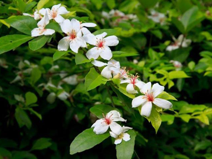 油桐花屬於離瓣花,為雌雄同株異花,花為白色有五瓣,呈五角星形。其雄花含8-10株紅色雄蕊,花粉為黃色,故油桐花色在白中透著淡紅與粉黃。油桐花屬於圓錐花序頂生,花形為綠色書筒狀,花冠呈白色,基部略帶紅色。由於花身輕盈曼妙,風一吹滿山遍野的白色油桐花翩翩飛舞,似飛雪飄落,故油桐花又有「五月雪」的美稱。
